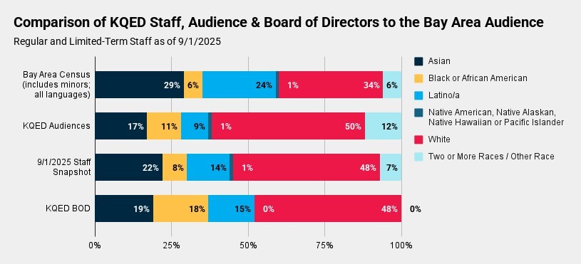 Note: The graph above reflects KQED’s staff race and ethnic representation in the context of the broad demographic categories recognized by the federal government.