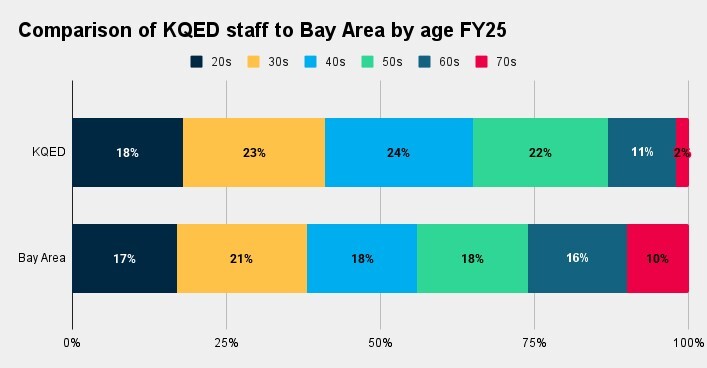 KQED’s workforce reflects a multigenerational mix of employees, with staff contributing perspectives from early-career professionals to those with decades of experience. This diversity in age strengthens our culture and helps us design programs, benefits, and development opportunities that meet employees where they are in their careers and lives.