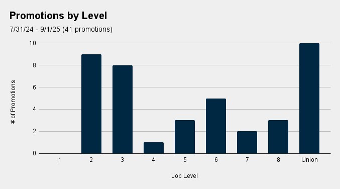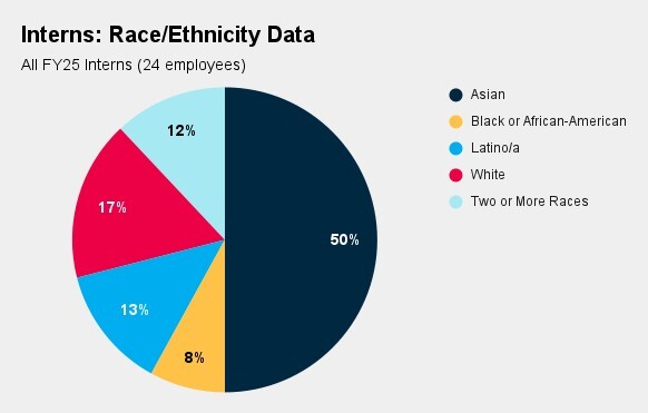 KQED has made sustained efforts to ensure transparency in the promotion process, resulting in more equitable advancement opportunities across the organization. In FY25, this work is reflected in the data: 64% of promotions went to employees identifying as female and 36% to male employees. Several of these promotions were offered to interns who successfully transitioned into on-call or regular staff positions, strengthening pathways into careers at KQED.