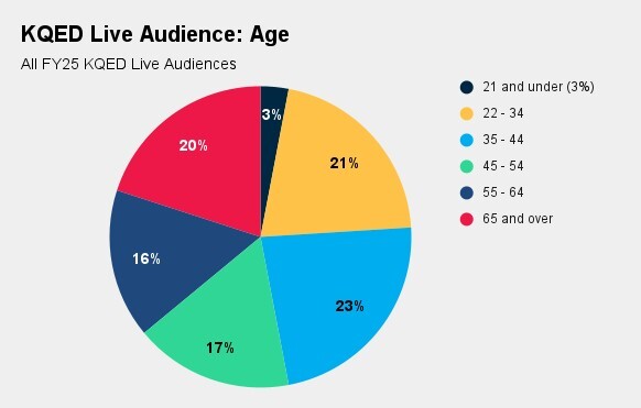 Fiscal year 2025 audience data shows that KQED Live continues to represent one of our most diverse audiences, with a 47% plurality of attendees identifying as BIPOC—an increase over last year. We also saw a 45% growth in audiences aged 44 and younger. This reflects progress on our goal to make KQED Live programming more representative of the Bay Area. Moving forward, KQED Live will continue this work by continuing to expand the proportion of our events developed with community partners, increasing the number of kid-friendly events and events produced in counties outside of San Francisco, and launch qualitative surveying to better understand what events can do to help widen a sense of belonging in the Bay Area.
