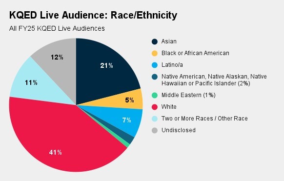 Note: The graph above reflects KQED Live audience’s race and ethnic representation in the context of the broad demographic categories recognized by the federal government