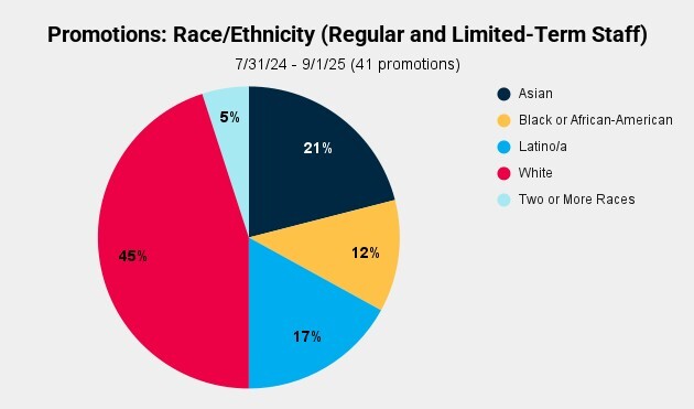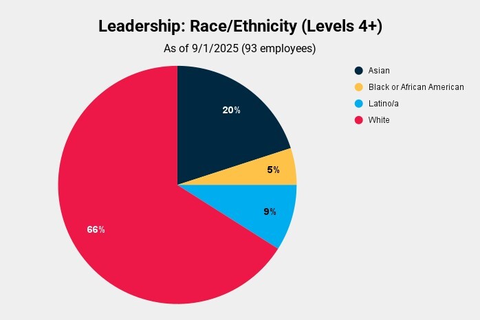 These charts show the racial and ethnic composition of staff receiving promotions as well as employees in leadership roles (levels 4 and above). Together, they highlight how our internal practices create opportunities for advancement that better reflect the Bay Area community.