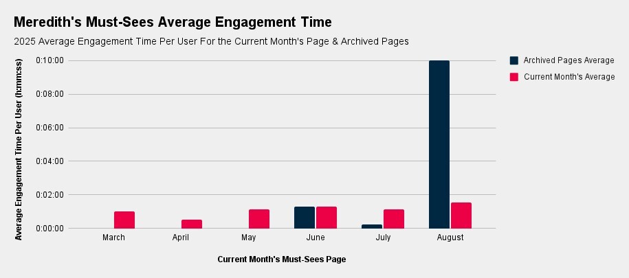 Audiences are not just visiting the page—they are spending more time with it. While April’s surge in traffic brought the average down to 0:31 per visit, subsequent updates steadily improved engagement. Adding archive links in June encouraged deeper exploration, pushing time on page to 1:29. By August, average engagement reached its highest point at 1:32, showing that viewers are forming stronger habits and staying longer with each visit.
