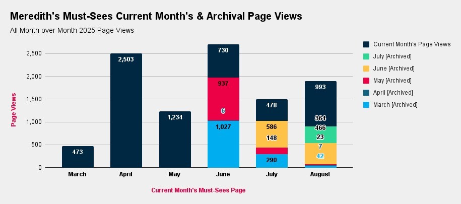 Views of the Must-Sees page climbed quickly after launch, peaking at 2,503 in April following the addition of a direct promo link in KQED’s main navigation. In May, LinkedIn promotion helped maintain visibility, while in June we introduced archive links at the bottom of the current month’s page. This gave audiences the option to revisit prior highlights, and the impact was immediate: more than 1,000 people revisited the March Must-Sees page from the June page alone, along with hundreds more exploring April and May. From that point forward, the chart shows not just how many people viewed the current month’s page, but also how many dug into archived pages during the same period—clear evidence that audiences are finding value in the full collection, not just what’s new.