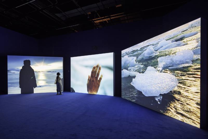 While most directors attempt to use the language of montage to tell a story roughly analogous to a novel, installation artists like Julien do something else entirely. The word “poem” comes to mind to describe the British artist’s work, but “fractal” is perhaps more fitting; Julien’s large-scale video projections get deeper and more complex the further you move through them. Images, words, sounds, colors and themes reproduce themselves across the multiple screens of Julien’s installation pieces, sending the eye ricocheting around in an effort to take it all in.