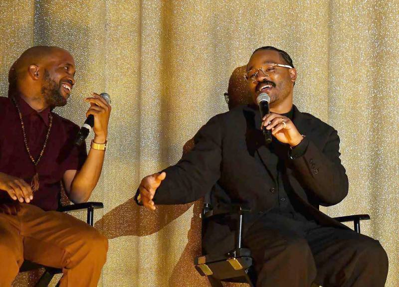 (L–R) Pendarvis Harshaw and Ryan Coogler onstage at the Grand Lake Theatre in Oakland after a screening of ‘Sinners,’ April 16, 2025. (Casey Flanigan/ImageSpace)
