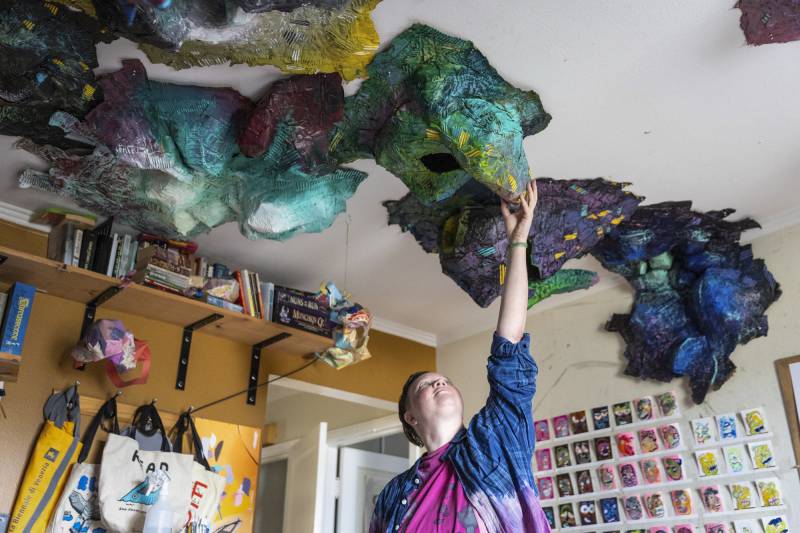 Eilo is a disabled San Francisco artist who lives with autism and chronic illnesses, and their work centers disabled audiences. They’re known for using artificial intelligence to build computational prosthetics, wearable art pieces that perform social and bodily tasks like smiling or logging memories. They also run an online series called Art School From Bed, short videos about art history and technique specifically for other artists who are chronically ill.
