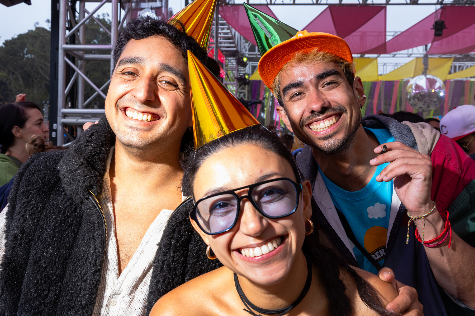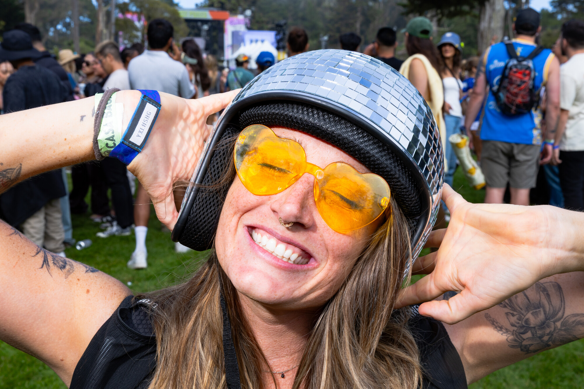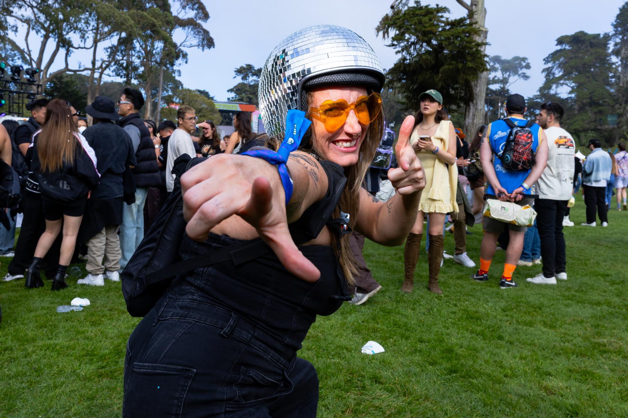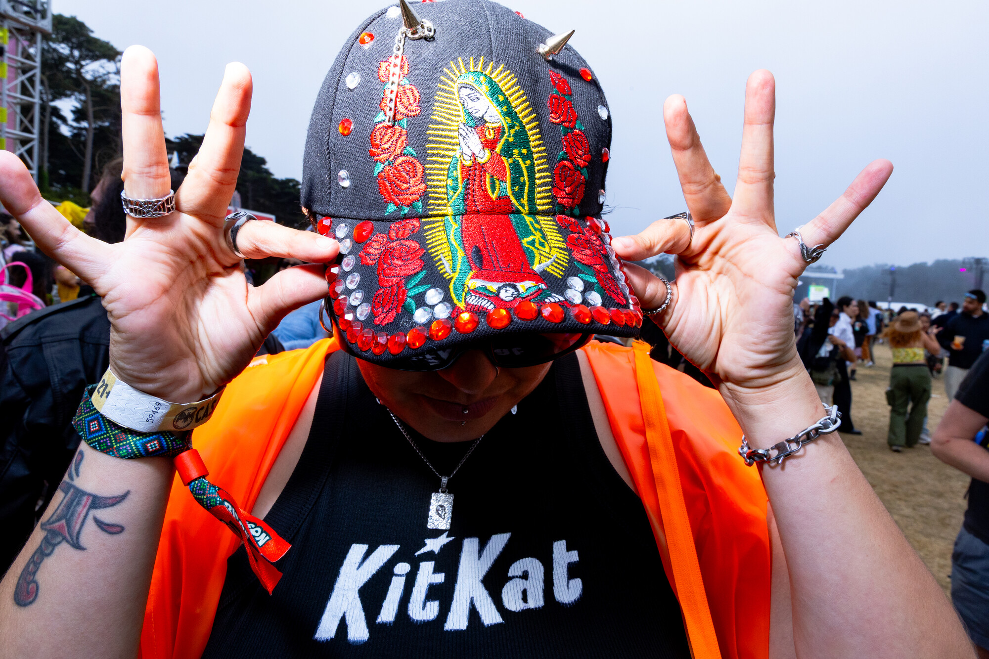 (L–R) Courtney Willoughby, 18, and her sister Sydney Willoughby, 22, wear coordinated orange outfits at Outside Lands on Sunday, August 10, 2025. The pair wanted to match for their first-ever Outside Lands. (Estefany Gonzalez for KQED)Digital KitKat, 34, a Bay Area based DJ, wears a studded Virgin Mary hat to Outside Lands on Saturday, August 9, 2025. Digital KitKat is one of the many local DJ’ who performed at Casa Bacardí during the three day festival. (Estefany Gonzalez for KQED)Angel Moua, 31, wears a bandana and large sunglasses to Outside Lands on Saturday, August 9, 2025. Moua traveled to Golden Gate Park from Sacramento to attend the festival. (Estefany Gonzalez for KQED)Nori Nakayama, right, poses for a portrait as Glass Animals performs at Outside Lands on Saturday, August 9, 2025. Singer Dave Bayley pointed to Nakayama during Glass Animals’ set and and made note that Nakayama attended the bands first ever Bay Area concert several years ago. (Estefany Gonzalez for KQED)Oakland’s Christie O’ Neill, 35, wears a disco ball helmet at Outside Lands on Friday, August 8, 2025. O’ Neill bought the helmet during a trip to Massachusetts and liked it so much she wore it on the plane ride back to California when it didn’t fit in her luggage. (Estefany Gonzalez for KQED)LaRussell poses for a portrait backstage at Outside Lands on Saturday, August 9, 2025. (Estefany Gonzalez for KQED)Daniel Sherman, 36, wears a thrifted fringe jacket to Outside Lands on Saturday, August 9, 2025. Sherman, a regular Oasis patron, was one of the many people enjoying drag performances at the Dolores’ stage. (Estefany Gonzalez for KQED)Mario Gonzalez, 23, and partner Sara Ramirez, 22, wear bucket hats Ramirez made by hand to Outside Lands on Saturday, August 9, 2025. (Estefany Gonzalez for KQED)Steffi Espinosa, 26, left, and Darby Shore, 26, hold ‘Wicked’ dolls at the Dolores’ stage at Outside Lands on Saturday, August 9, 2025. (Estefany Gonzalez for KQED)From left, Nico Cerda, Cami Castro, and Alex Favela, wear matching party hats at Outside Lands on Saturday, August 9, 2025. (Estefany Gonzalez for KQED)Baalti poses for a portrait at Outside Lands on Friday, August 8, 2025. (Estefany Gonzalez for KQED)Courtney Willoughby, 18, wears layered necklaces at Outside Lands on Sunday, August 10, 2025. Willoughby attended the festival with her holder sister Sydney Willoughby, and wore coordinated orange outfits. (Estefany Gonzalez for KQED)EJ Viray, 33, dances as Anderson .Paak performs at Outside Lands on Saturday, August 9, 2025. (Estefany Gonzalez for KQED)Paco Amoroso poses for a portrait at Outside Lands on Sunday, August 10, 2025. (Estefany Gonzalez for KQED)Ben Van Deusen, center left, and Victoria Edwards watch Ca7riel and Paco Amoroso perform at Outside Lands on Sunday, August 10, 2025. The two wore fuzzy blue hats inspired by the one Paco Amoroso had on during Ca7riel and Paco Amoroso’s NPR Tiny Desk performance. (Estefany Gonzalez for KQED)Les Tran, 35, cuddles with Joshua Tree, 29, at Outside Lands on Saturday, August 9, 2025. The two met on Grindr an hour before catching a drag performance at Dolores’ stage together. (Estefany Gonzalez for KQED)People cheer as Kitty Litter and Évian perform on the Dolores’ stage at Outside Lands on Saturday, August 9, 2025. (Estefany Gonzalez for KQED)Tommy Gaerlan, 30, center left, and Jordan Castro, 26, dance as LaRussell performs at Outside Lands on Saturday, August 9, 2025. (Estefany Gonzalez for KQED)Oakland Christie O’ Neill, 35, wears a disco ball helmet at Outside Lands on Friday, August 8, 2025. O’ Neill bought the helmet during a trip to Massachusetts and liked it so much she wore it on the plane ride back to California when it didn’t fit in her luggage. (Estefany Gonzalez for KQED)Noah Ketterer, 26, fans himself as he dances at the Dolores’ stage at Outside Lands on Saturday, August 9, 2025. (Estefany Gonzalez for KQED)Festival goers dance along the Panhandle stage as Fcukers perform at Outside Lands on Friday, August 8, 2025. (Estefany Gonzalez for KQED)Fans dance in the front of the Lands End Stage as LaRussell performs at Outside Lands on Saturday, August 9, 2025. (Estefany Gonzalez for KQED)