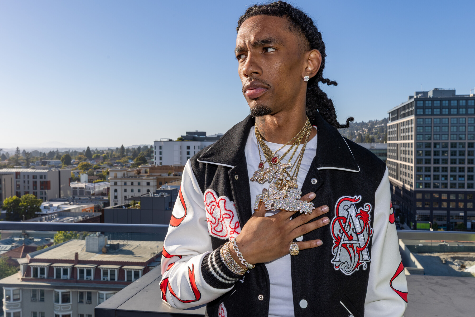 Just look at his jewelry. When we meet for our interview at a Berkeley rooftop bar on a recent afternoon, the Sacramento rapper rolls up wearing a half dozen chains with heavy, gem-encrusted pendants. One features a 3D, cartoon version of himself perched on a toilet, an homage to one of his best-known bars: “I’m not rappin’ / I just shit talk.”