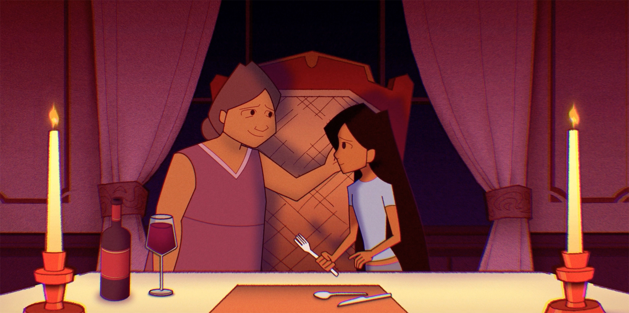 “Lukso ng Dugo” is a Filipino idiom that directly translates to “jumping blood,” and describes the sensation of immediate kinship with a stranger. This concept is demonstrated through Lukso ng Dugo’s storyline about Mae, a Filipino girl who finds the courage to break the cycle of abuse in her family. During a tense dinner, a creature appears, helping Mae and her mother confront their fears and take the first steps toward healing.