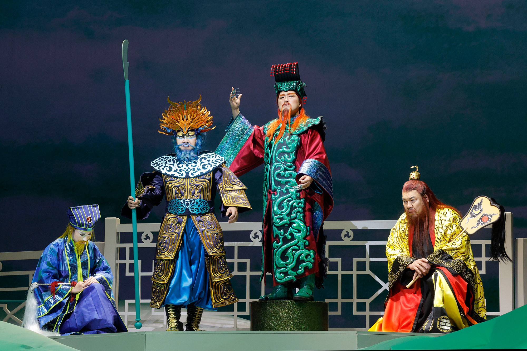 Hongni Wu as Venus Star, Joo Won Kang as Dragon King Ao Guang, Konu Kim as Jade Emperor, and Peixin Chen as Supreme Sage Laojun in Huang Ruo and David Henry Hwang’s ‘The Monkey King.’ (Cory Weaver/San Francisco Opera)