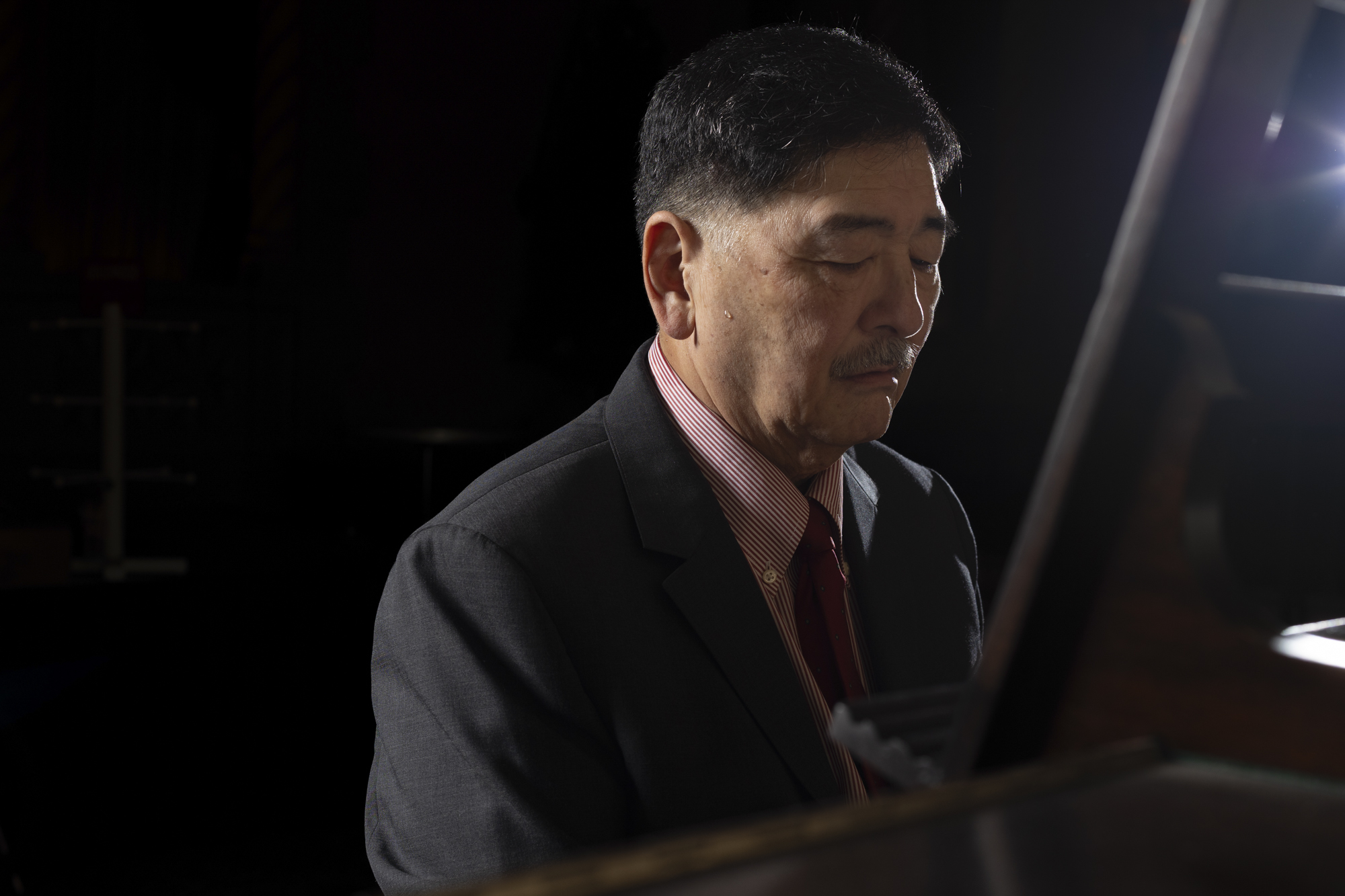 Jerry Nagano poses with the California Theatre’s 1928 Wurlitzer lobby organ in San Jose on Dec. 10, 2025. Nagano, a veteran theater-organ performer and retired Stanford systems engineer, has been a fixture in California’s organ community for decades. (Gustavo Hernandez/KQED)