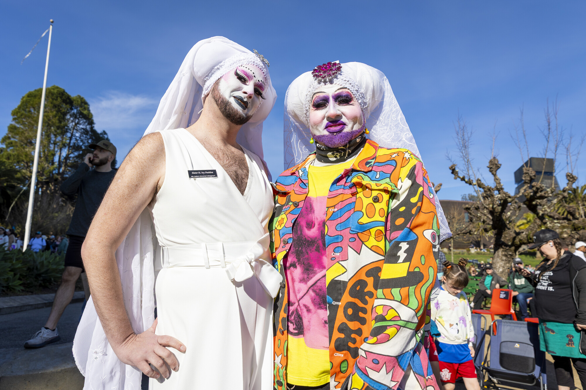 “We’re out here today to celebrate Claude,” said Sister T’aint A Virgin, who was one of five Sisters of Perpetual Indulgence in attendance. “He stood for the inclusion and the diversity that San Francisco is famous for, and that’s the heart blood of our city. He was living his life boldly and out loud. As a fellow animal that paints their face in white, I figured it was the best opportunity to show up and show out for community as well.”