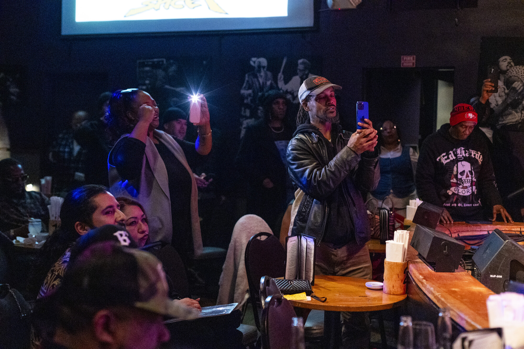 Audience members film Spice 1 as he performs at Yoshi’s in Oakland on January 8, 2026. (Tâm Vũ / KQED)