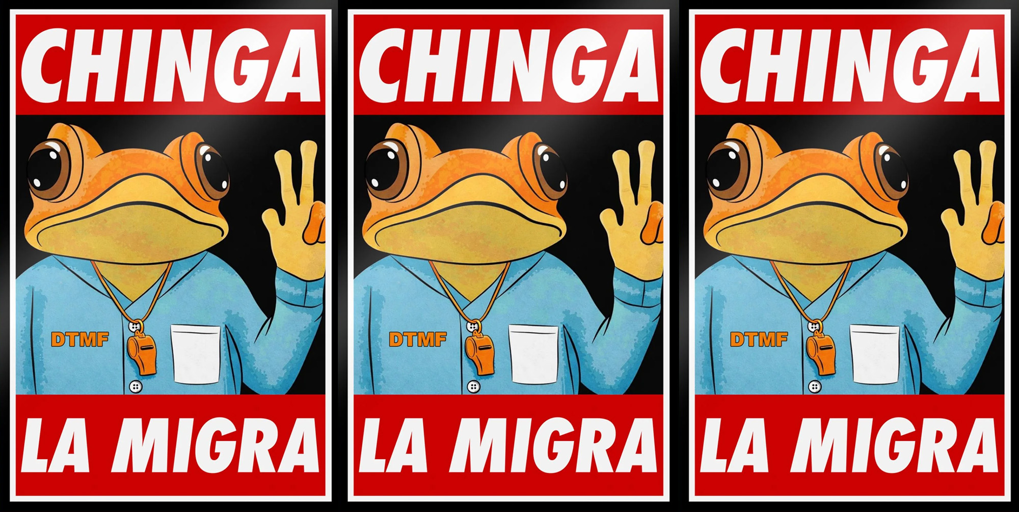The design is simple: Sapo Concho staring directly at the viewer while bold Barbara Kruger-style letters spell out “Chinga la Migra” or “Fuck ICE.” Around his neck, Sapo Concho wears a whistle similar to those used by volunteers with rapid response networks trained to spot ICE activity and alert vulnerable community members.