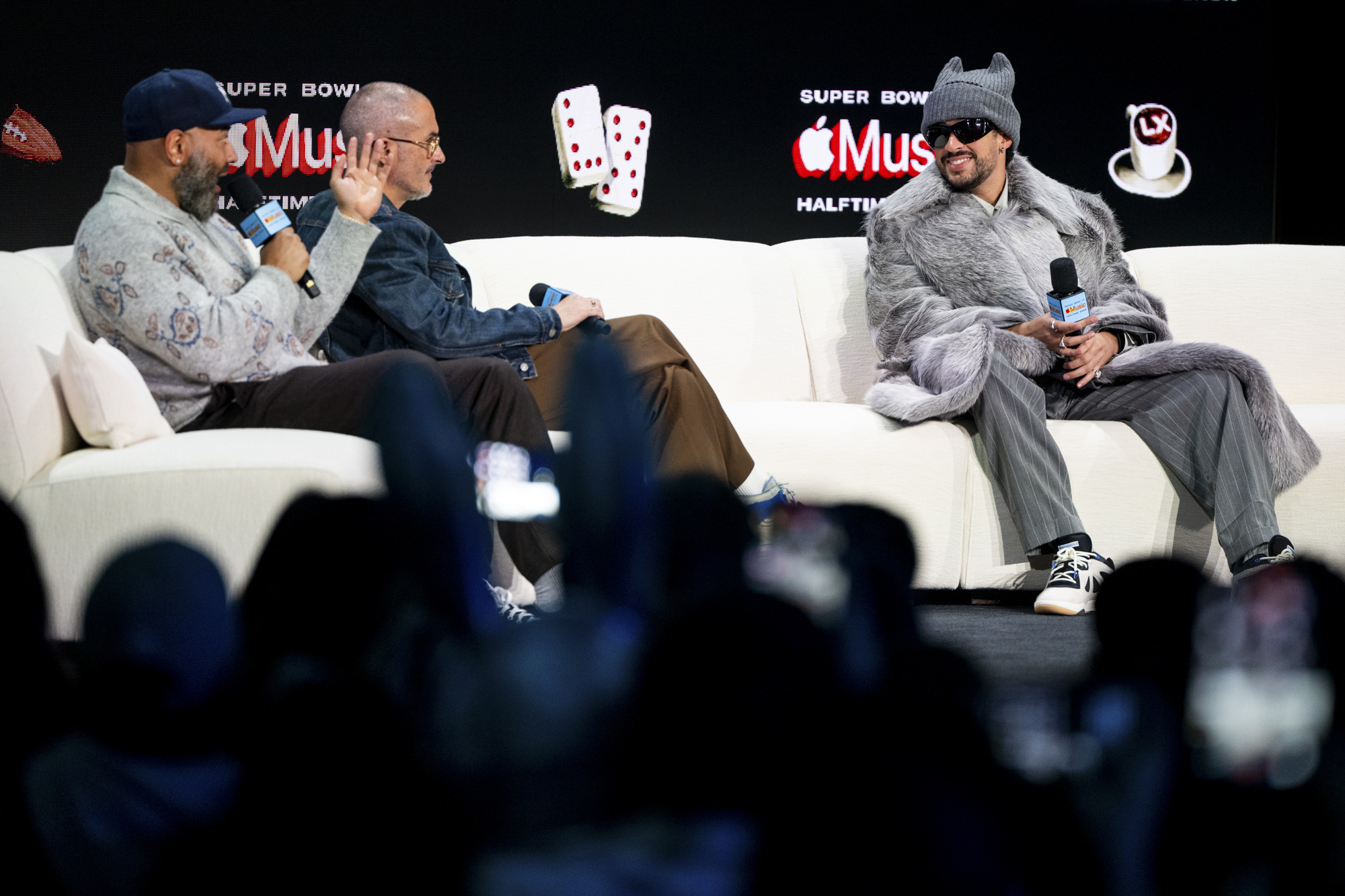 Bad Bunny speaks with Apple Music Radio’s Ebro Darden and Zane Lowe during a press conference at Moscone Center in San Francisco on Thursday, Feb. 5, 2026, ahead of headlining the halftime show at Super Bowl LX in on Sunday. (Beth LaBerge/KQED)