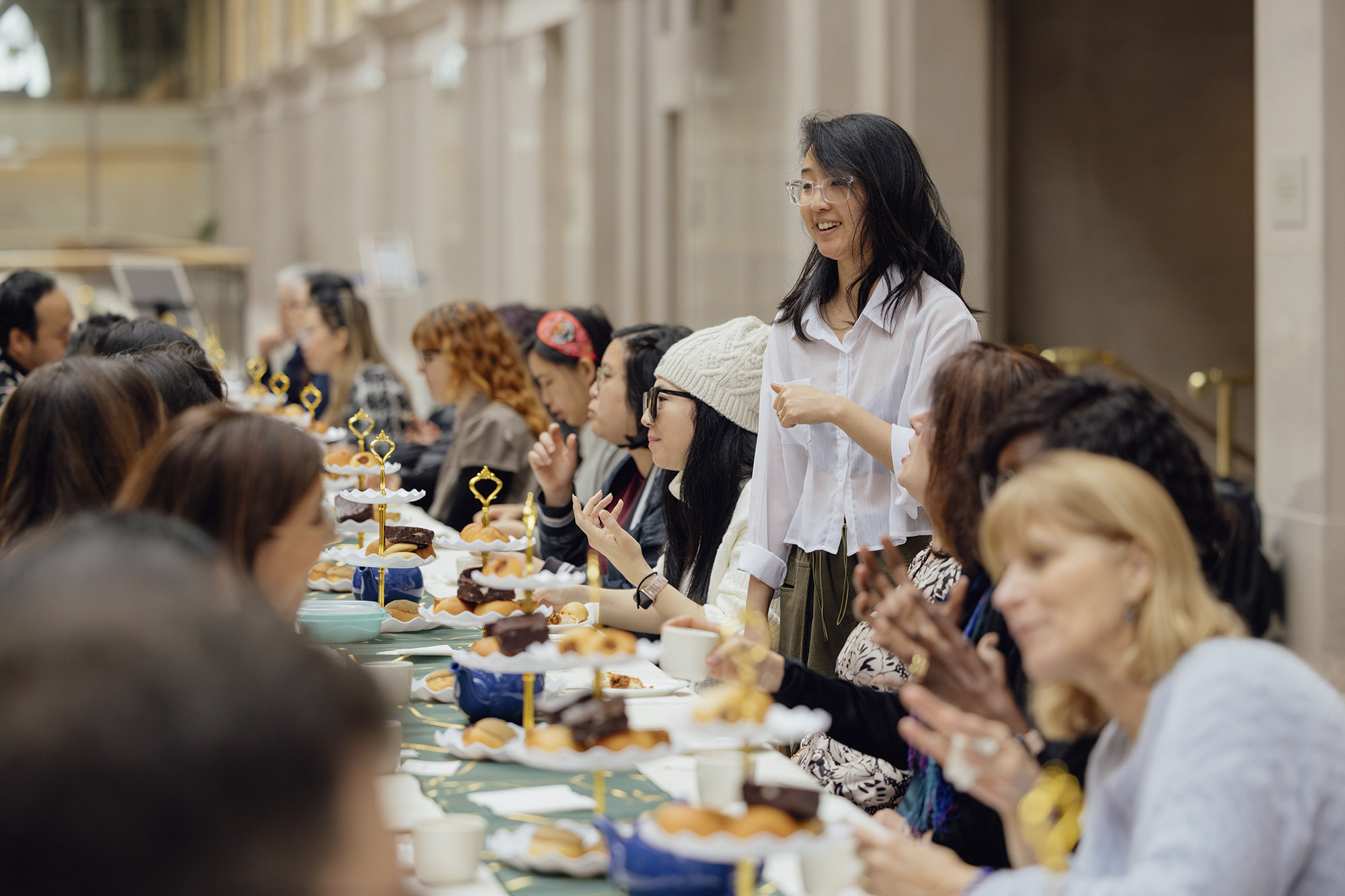 Little Moon Bakehouse owner Annie Wang (standing) mingles with guests at her afternoon tea pop-up at the San Francisco Ferry Building on Dec. 14, 2025. Featured items included plant-based mooncakes and mini pork floss buns. (Phil Stockbridge/SF Event Photo)