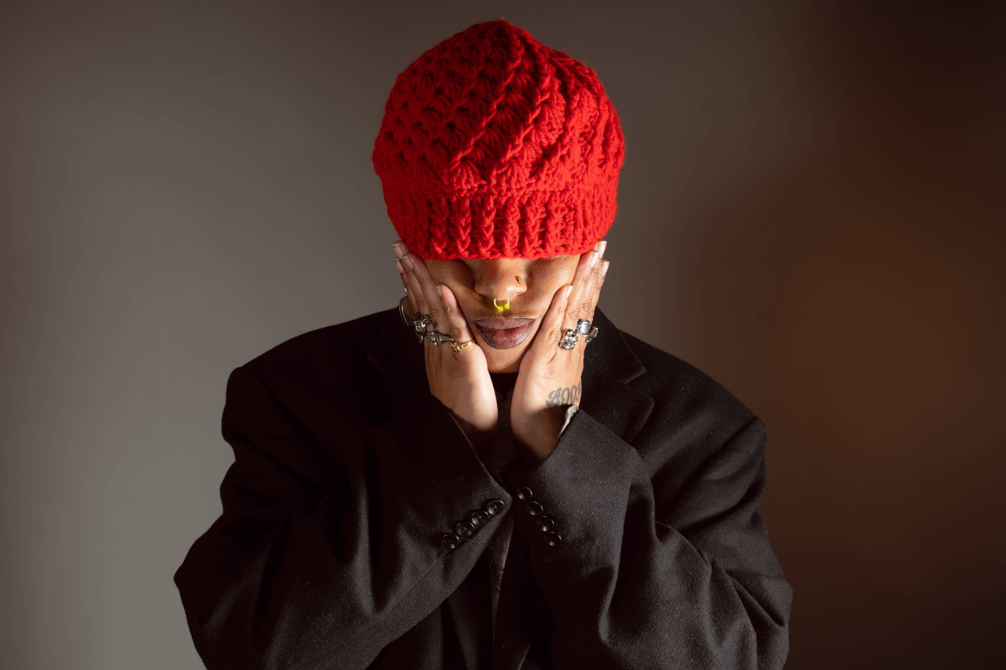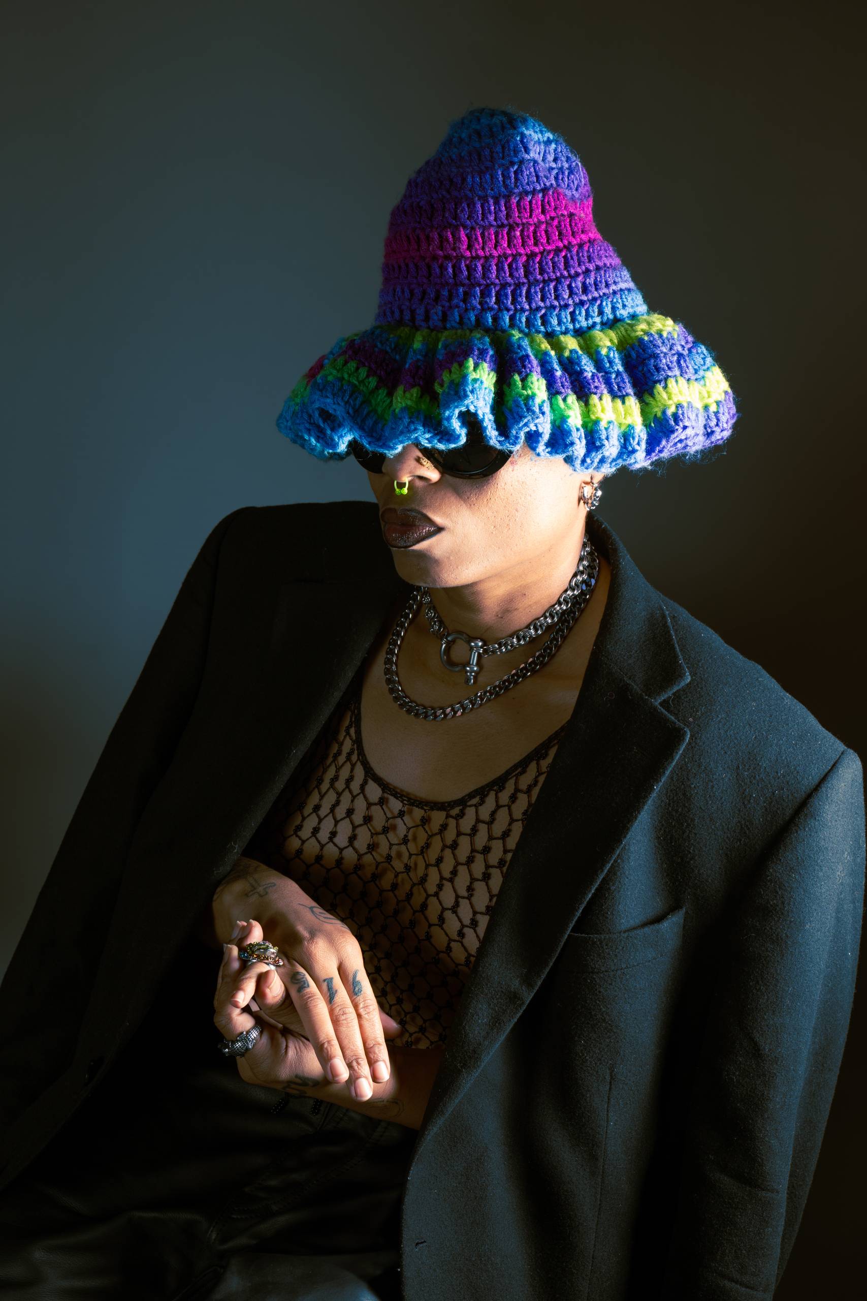 For their debut, Dill will focus on hats, an intergenerational project with their aunt, who Dill would often see knitting and crocheting when they were growing up. Their work experiments with height, structure and bright colors, creating a strong, noticeable presence atop the head. The hats augment the wearer’s silhouette to challenge assumptions about race and gender.