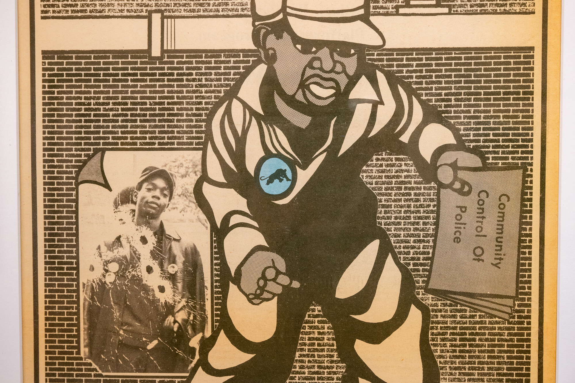 A Black Panther Party newspaper cover by Emory Douglas at the African American Art & Culture Complex in San Francisco on Feb. 18, 2026. (Beth LaBerge/KQED)