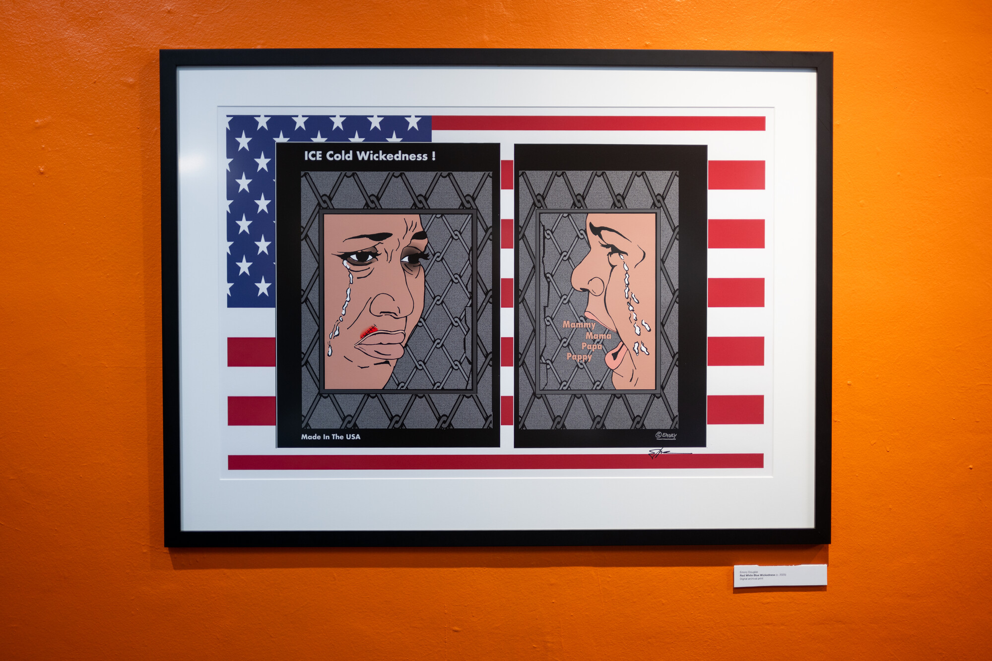 ‘Red White Blue Wickedness’ (2025) by Emory Douglas at the African American Art & Culture Complex in San Francisco on Feb. 18, 2026. (Beth LaBerge/KQED)