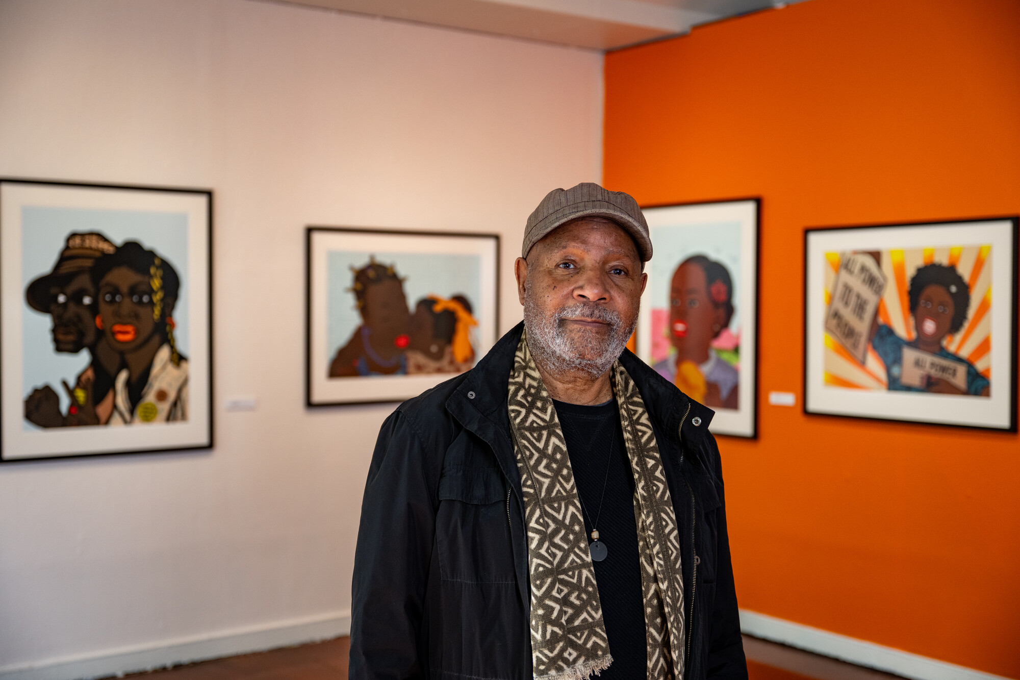 Artist Emory Douglas poses for a portrait at the African American Art & Culture Complex in San Francisco on Feb. 18, 2026, where his exhibition ‘In Our Lifetime’ is on view. The show highlights more than five decades of his influential political artwork, including pieces created for the Black Panther Party. (Beth LaBerge/KQED)