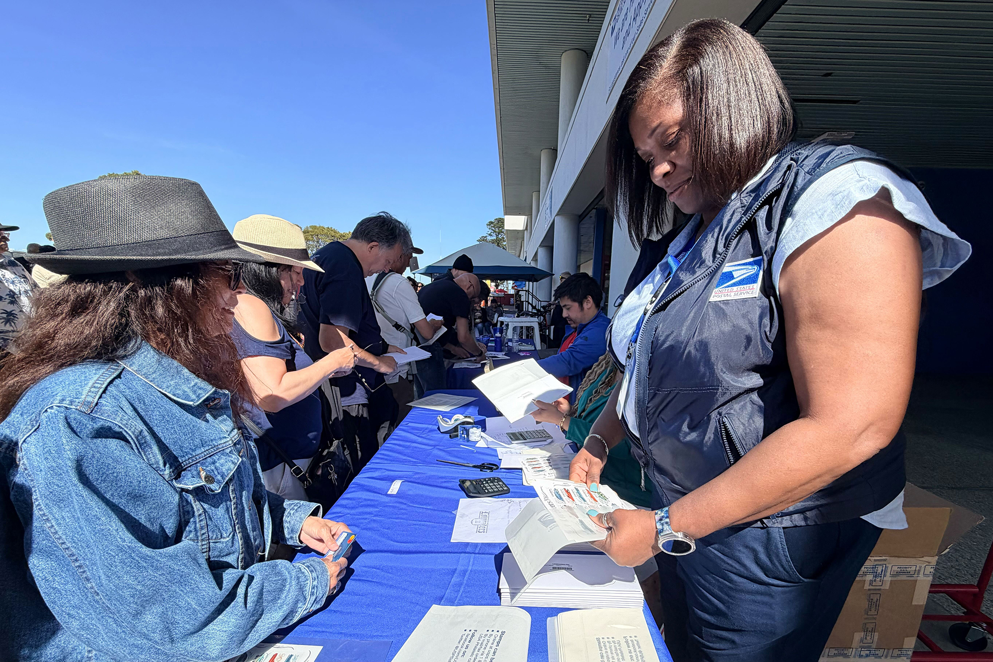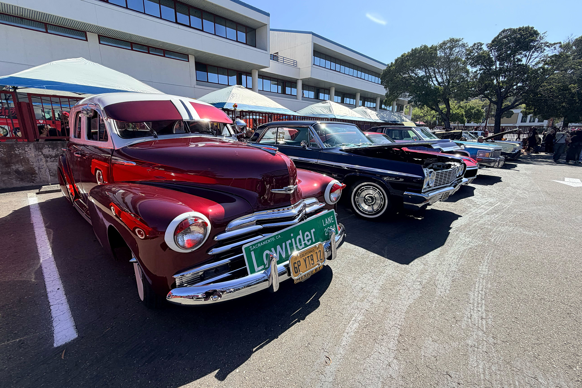 On Saturday morning, lowrider cars in a spectrum of colors cruised into the parking lot of the USPS processing center in Hunters Point, their glistening chrome finish and intricate airbrushings drawing attention from attendees.