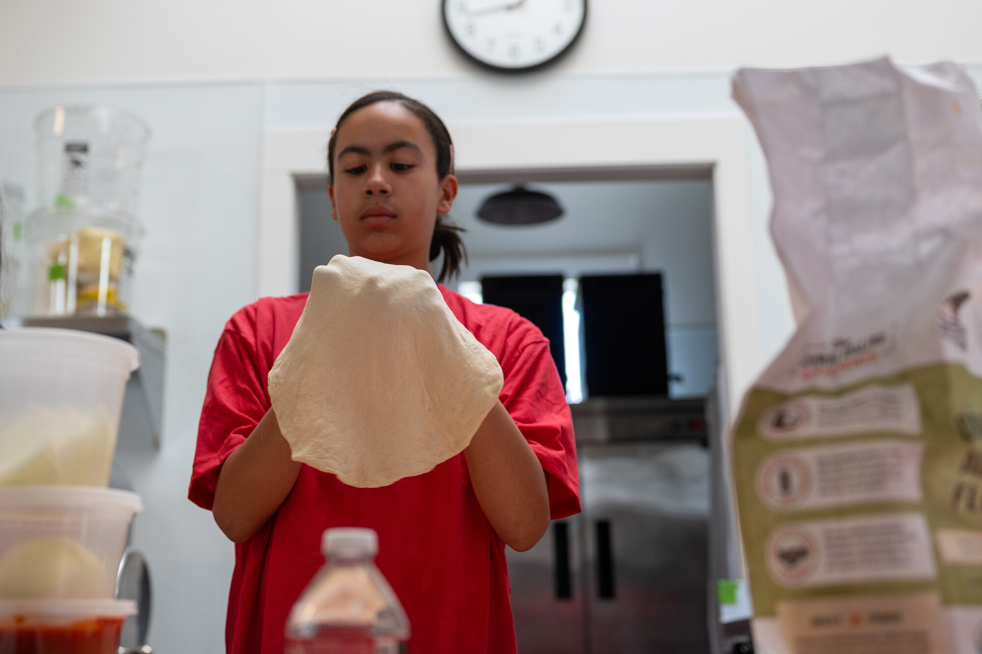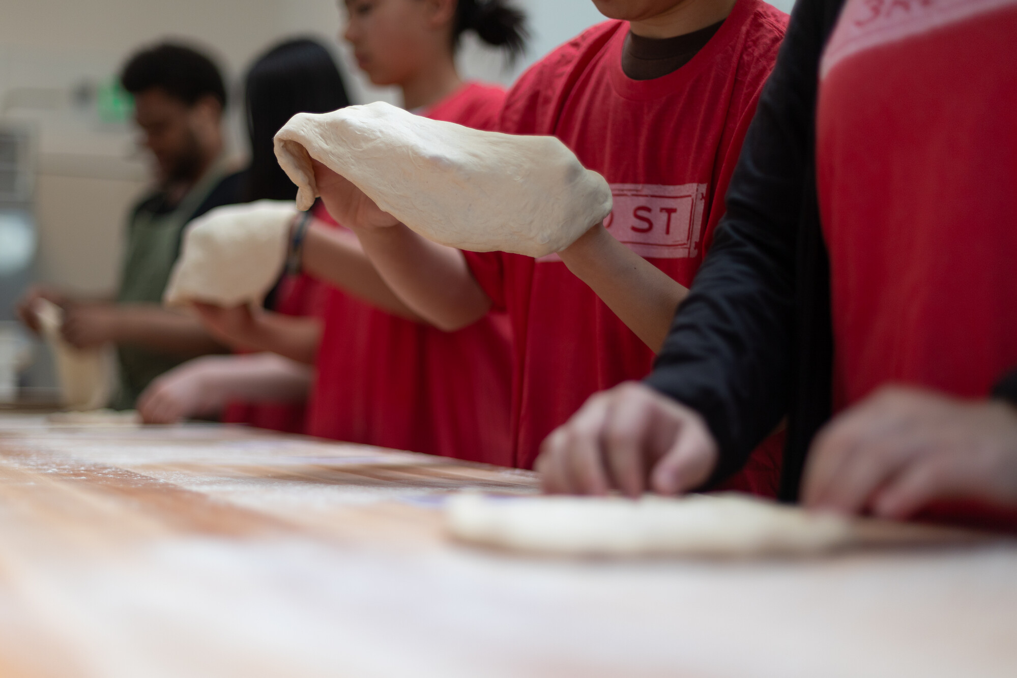 Youth participants shape pizza dough during the March 2026 edition of the free baking workshop. (Gustavo Hernandez/KQED)