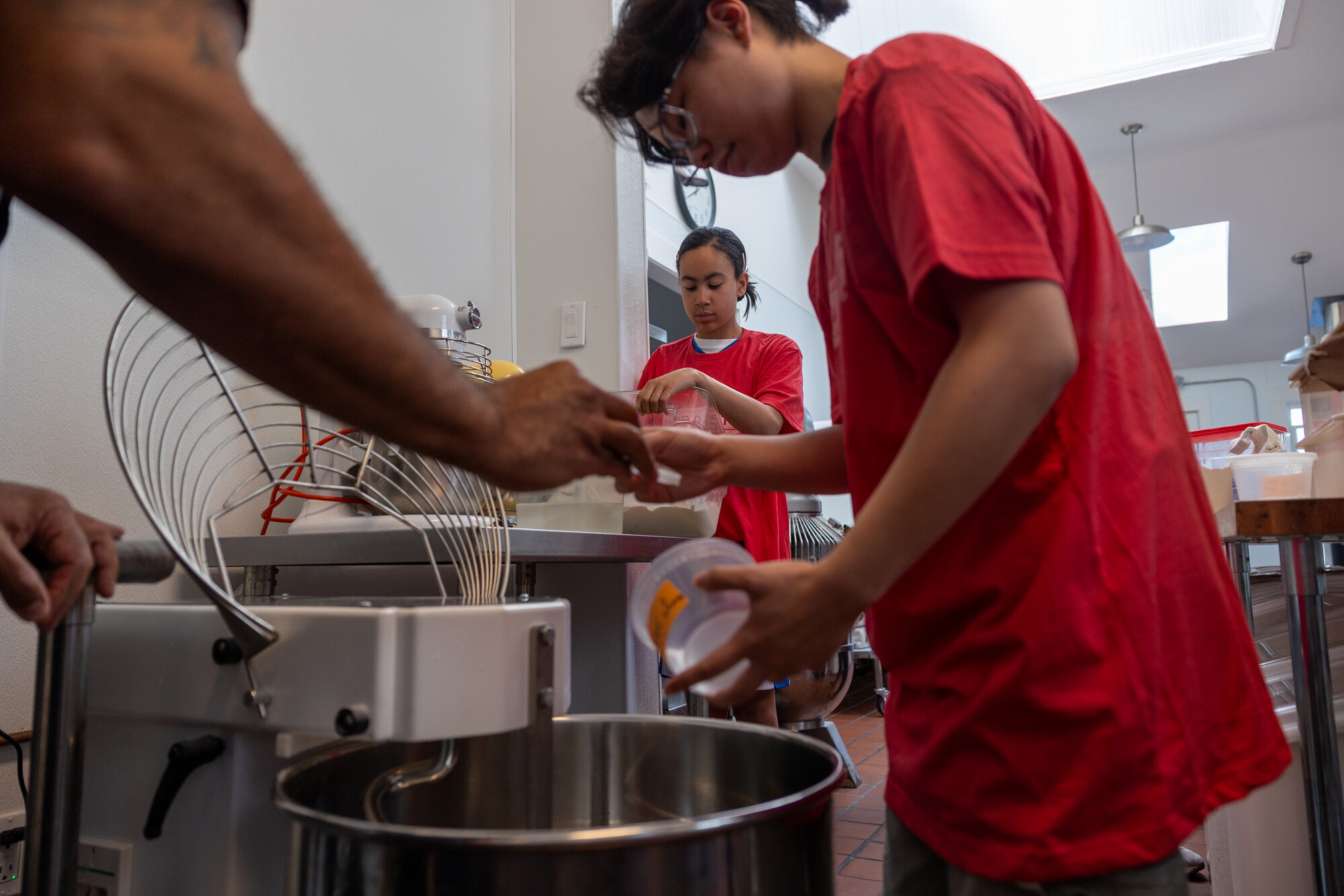 Bailey Gee, right, pours yeast into a mixer as Marina Sanchez prepares dough during a youth baking workshop at Bayview Makers Kitchen. (Gustavo Hernandez/KQED)