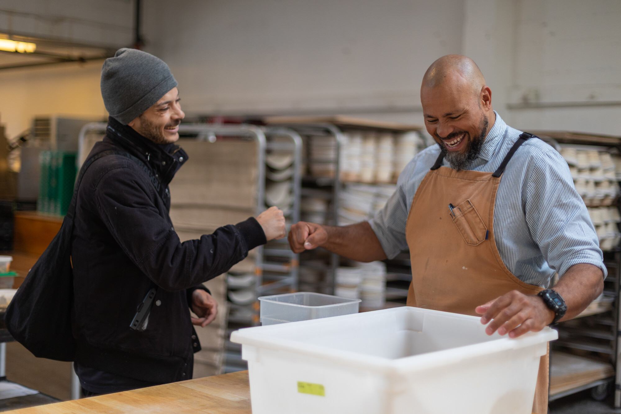 From left, Keyan Depillo, dough team lead, and owner Azikiwee Anderson greet each other with a fist bump inside Rize Up Bakery on April 3, 2026, in San Francisco. (Gustavo Hernandez/KQED)