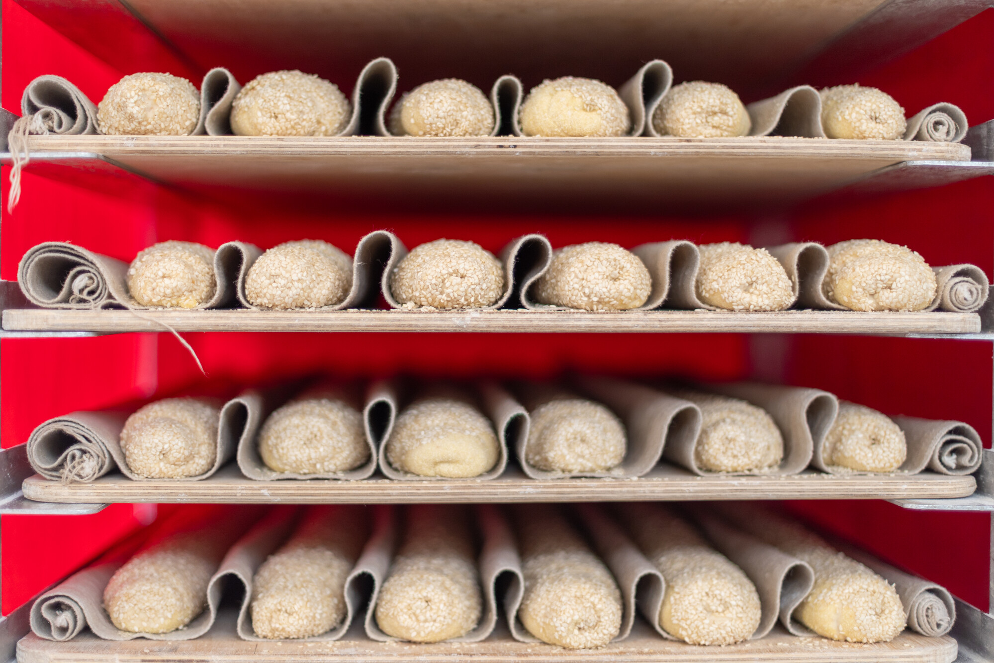 At Rize Up Bakery, rows of sesame seed–coated loaves sit on a rack lined with cloth couche as they proof. (Gustavo Hernandez/KQED)