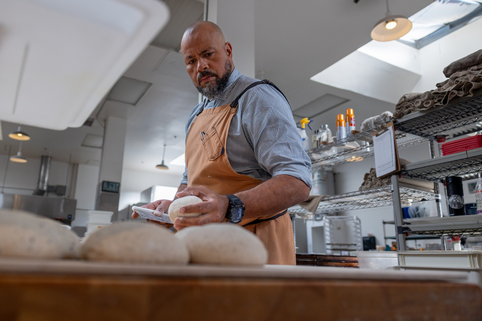 Azikiwee Anderson shapes rounds of dough at a worktable inside Rize Up Bakery’s main production facility in SoMa on April 3, 2026. (Gustavo Hernandez/KQED)