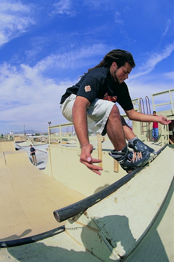 Anderson performs a skate trick during the Team Rollerblade tour, circa 2000. Before he became a baker, Anderson had a long career as a professional inline skater. (Courtesy of Azikiwee Anderson)
