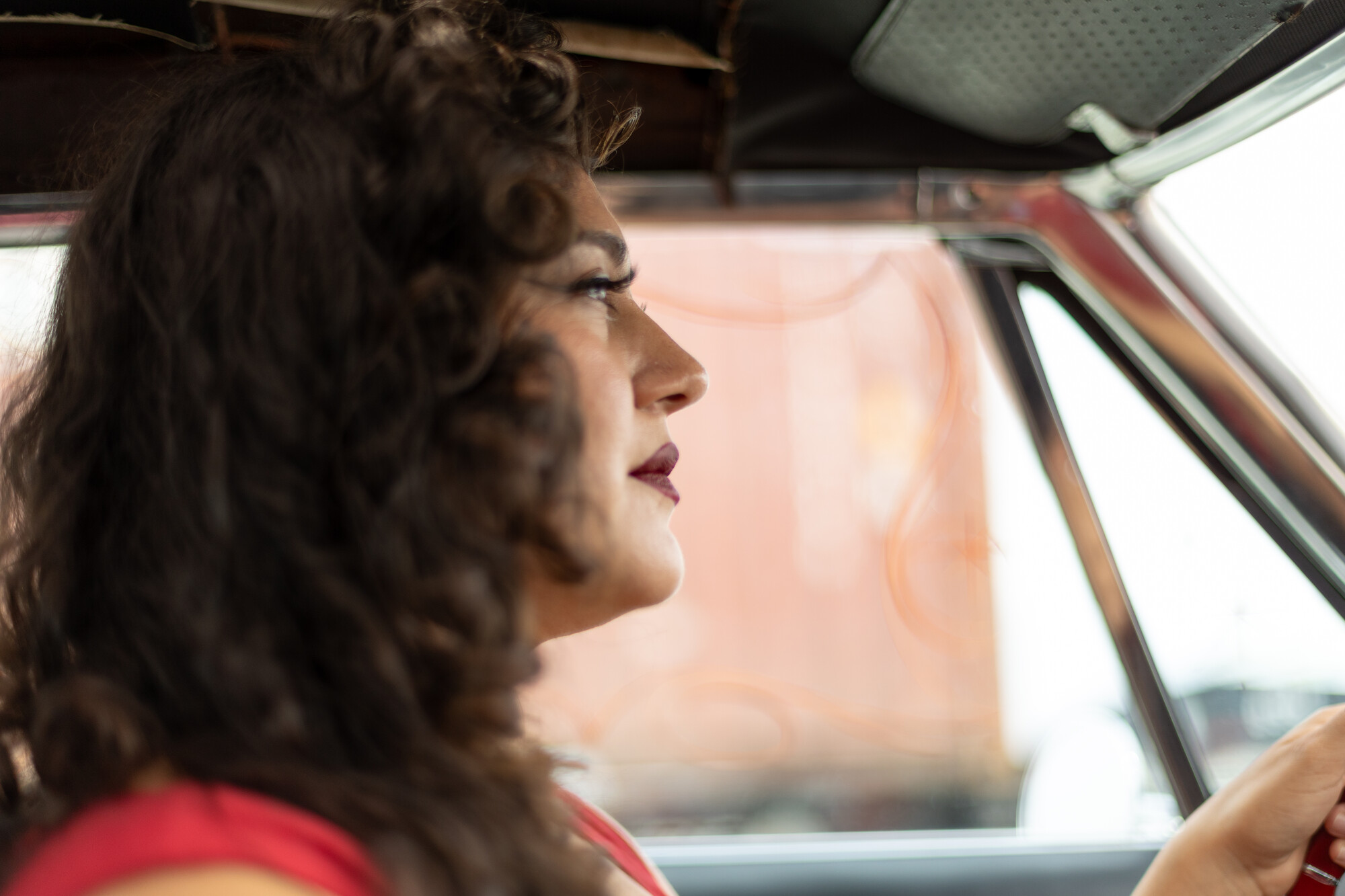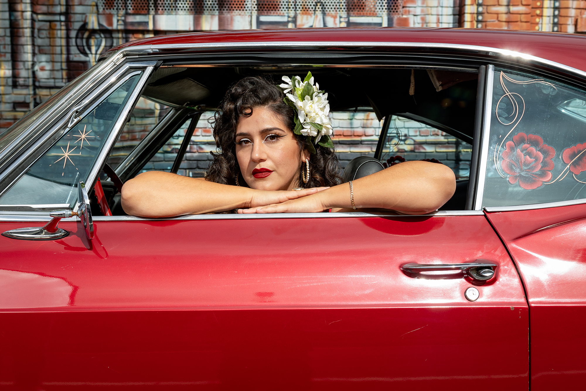 La Doña poses in the inside of her vintage Chevrolet Impala coupe in West Oakland on April 24, 2026. (Gustavo Hernandez/KQED)