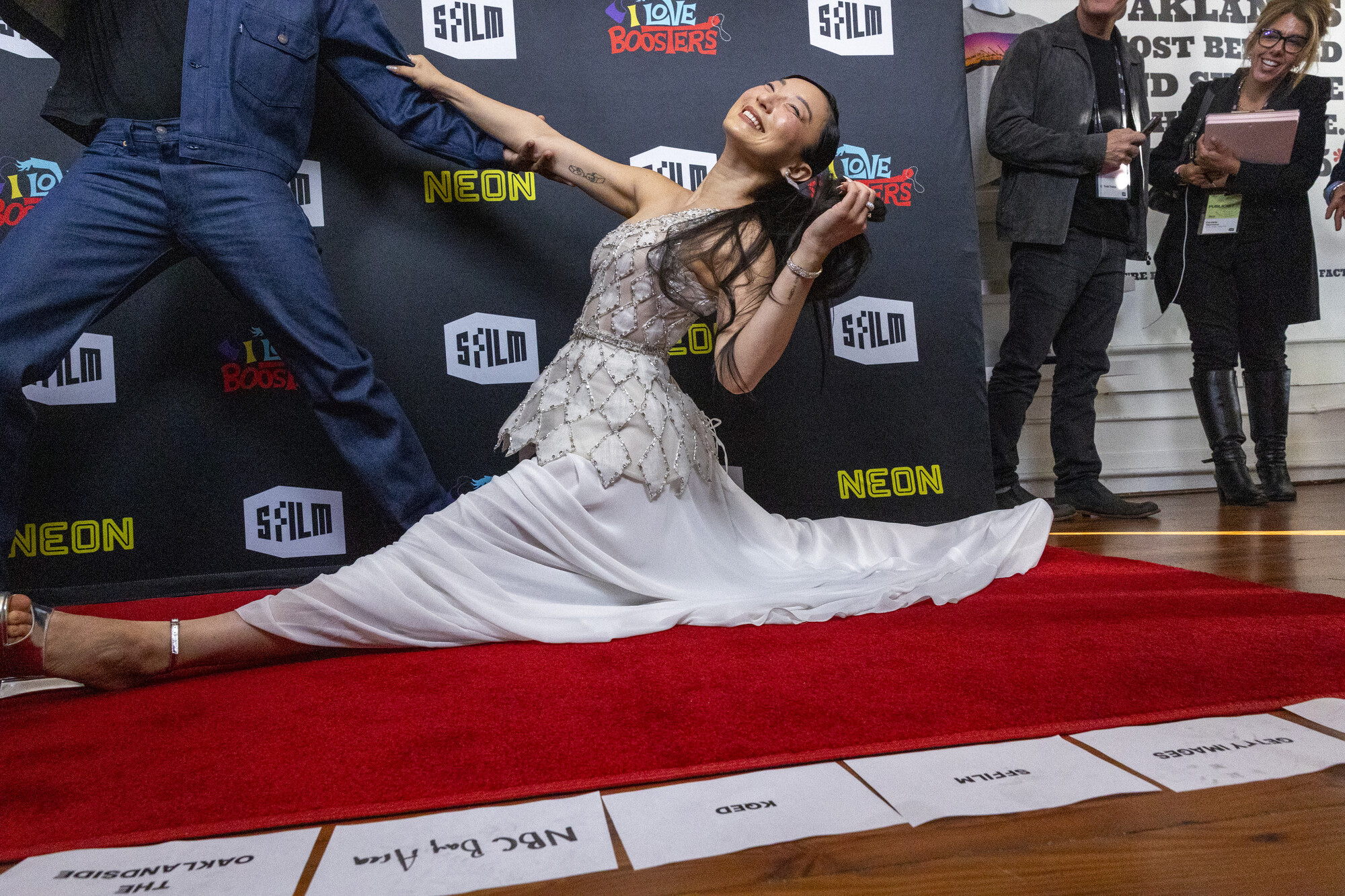 Poppy Liu doing the splits on the red carpet — not an elegant walkway, but a rug crammed inside an Oakland storefront full of sweaty reporters — wasn’t the only lovably chaotic moment at the West Coast premiere of Boots Riley’s I Love Boosters during the San Francisco International Film Festival.