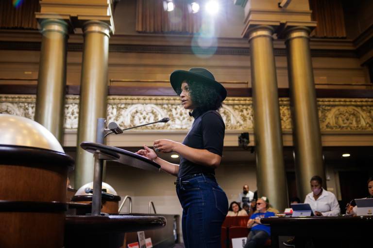"caption": "Rachel Sanders gives public comment at an Oakland City Council meeting advocating against the elimination of the Cultural Affairs Manager position from the city budget in Oakland on July 1, 2025.",