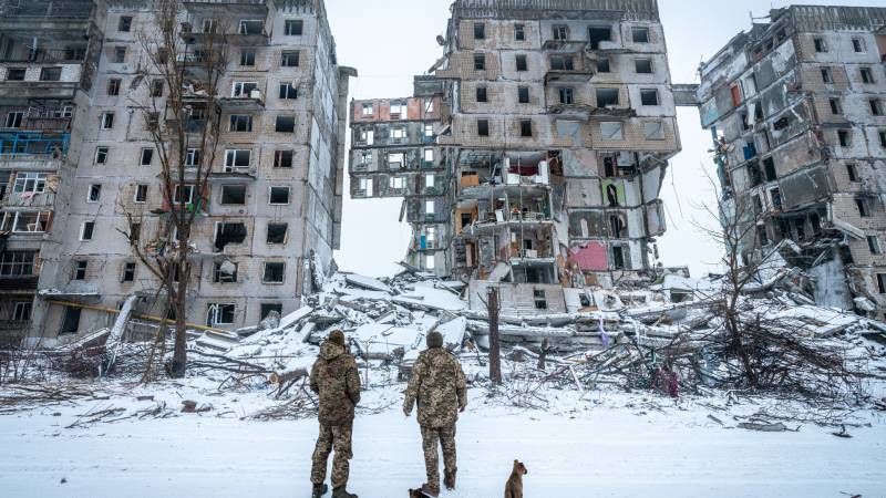 Ukrainian soldiers stand in front of a building destroyed by a Russian rocket attack as Russia-Ukraine war continues in Donetsk Oblast, Ukraine on January 26, 2024. (Anadolu via Getty Images)