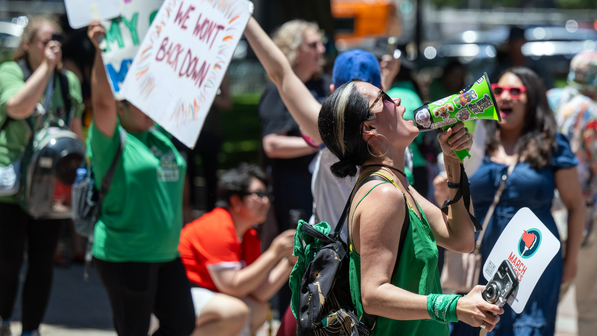 People march in a circle after a press conference outside Los Angeles City Hall on Monday, June 24, 2024. On the two-year anniversary of the U.S. Supreme Court's decision to overturn Roe v. Wade, the Women's March Foundation held the event as part of a nationwide walkout for women's reproductive rights. (Los Angeles Daily News/Getty Images)