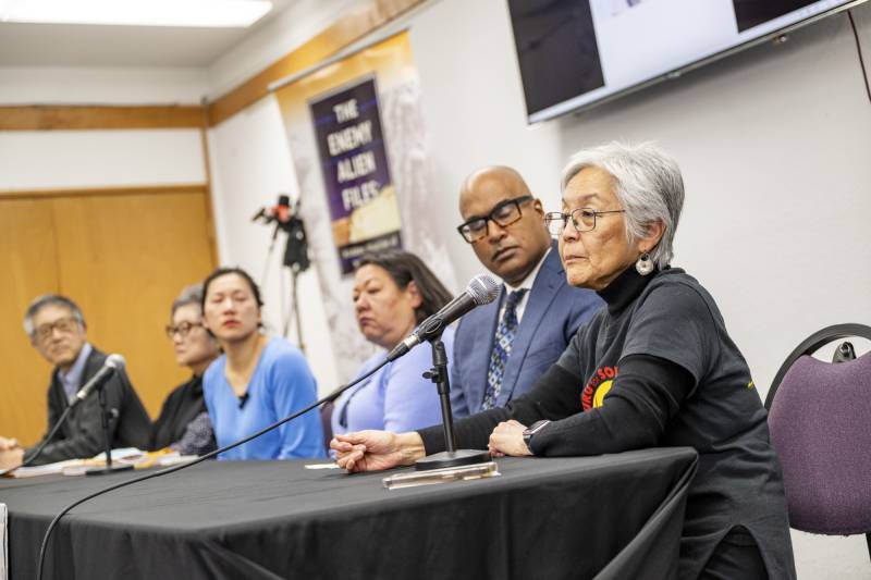 Satsuki Ina (right), from Tsuru for Solidarity, speaks at the Japanese Cultural and Community Center in San Francisco on March 20, 2025, during a press conference condemning the use of the Alien Enemies Act to target immigrants. (Beth LaBerge/KQED)