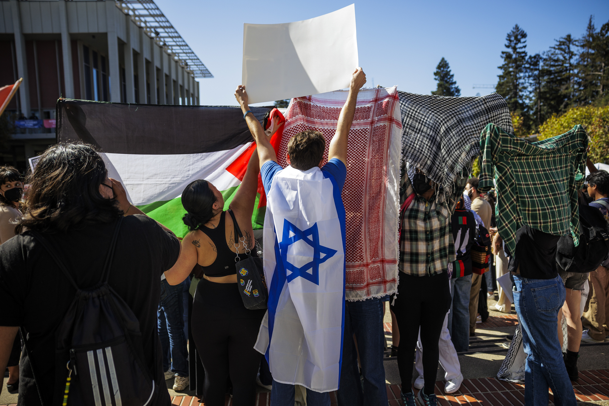 As hundreds of people gathered at Sproul Plaza, the site of last school year’s pro-Palestinian encampment, a group of about half a dozen counterprotesters draped in Israeli flags walked across the steps behind the speakers and started shouting things like, “Bring them home.”