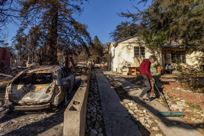David Slater, right, clears the driveway from his home, spared from the Eaton Fire in Altadena, Los Angeles County, on Jan. 12, 2025. (Ethan Swope/AP Photo)
