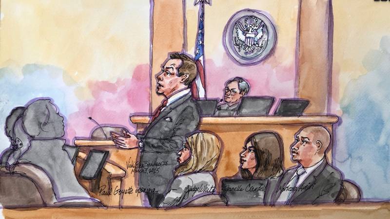 Paul Goyette, defense attorney for former Antioch police officer Morteza Amiri, gives his opening statement in the federal trial against Amiri and another former Antioch officer at the U.S. District Courthouse in Oakland on March 3, 2025. Amiri, seated at lower right, faces charges that he and former officer Devon Christopher Wenger conspired to severely injure suspects over a period of three years. (Vicki Behringer for KQED)