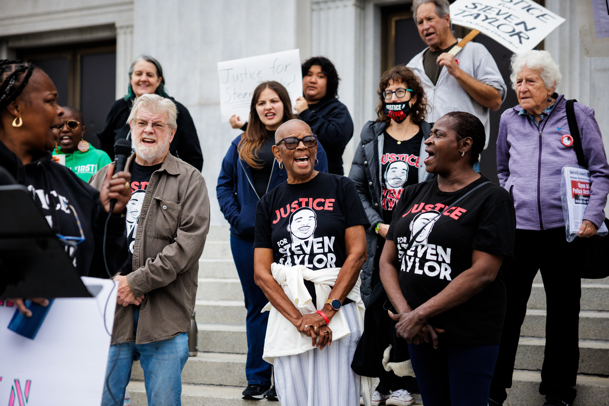 Addie Kitchen (center), Sharon Taylor (center right) and others chant Steven Taylor’s name at a rally in front of the Rene C. Davidson Courthouse in Oakland on Sept. 12, 2025. (Martin do Nascimento/KQED)