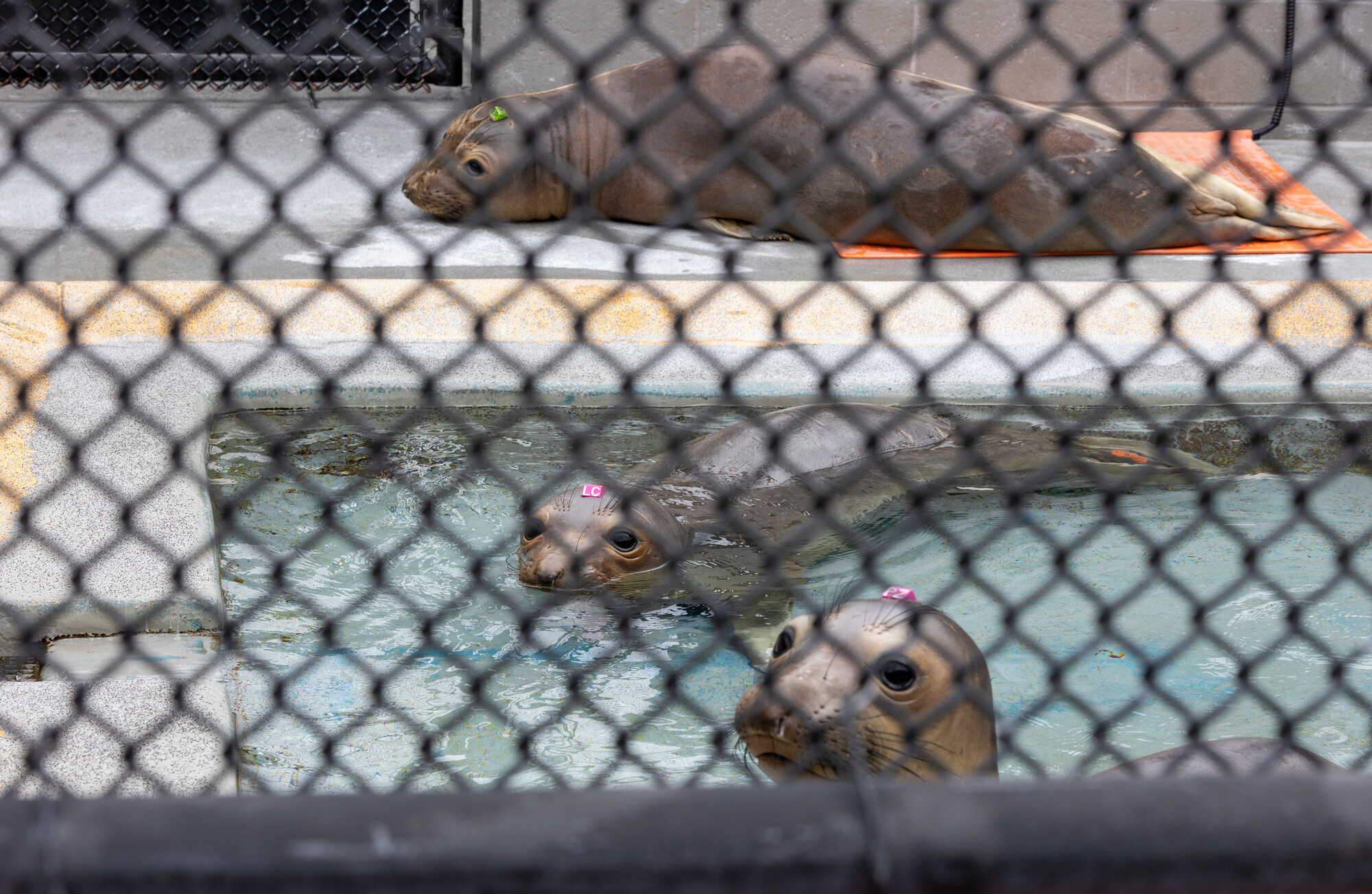 Three juvenile elephant seals—one hauled out on an orange mat and two lingering at the pool’s edge—wait behind the fence at The Marine Mammal Center in Sausalito on July 15, 2025. (Gustavo Hernandez/KQED)