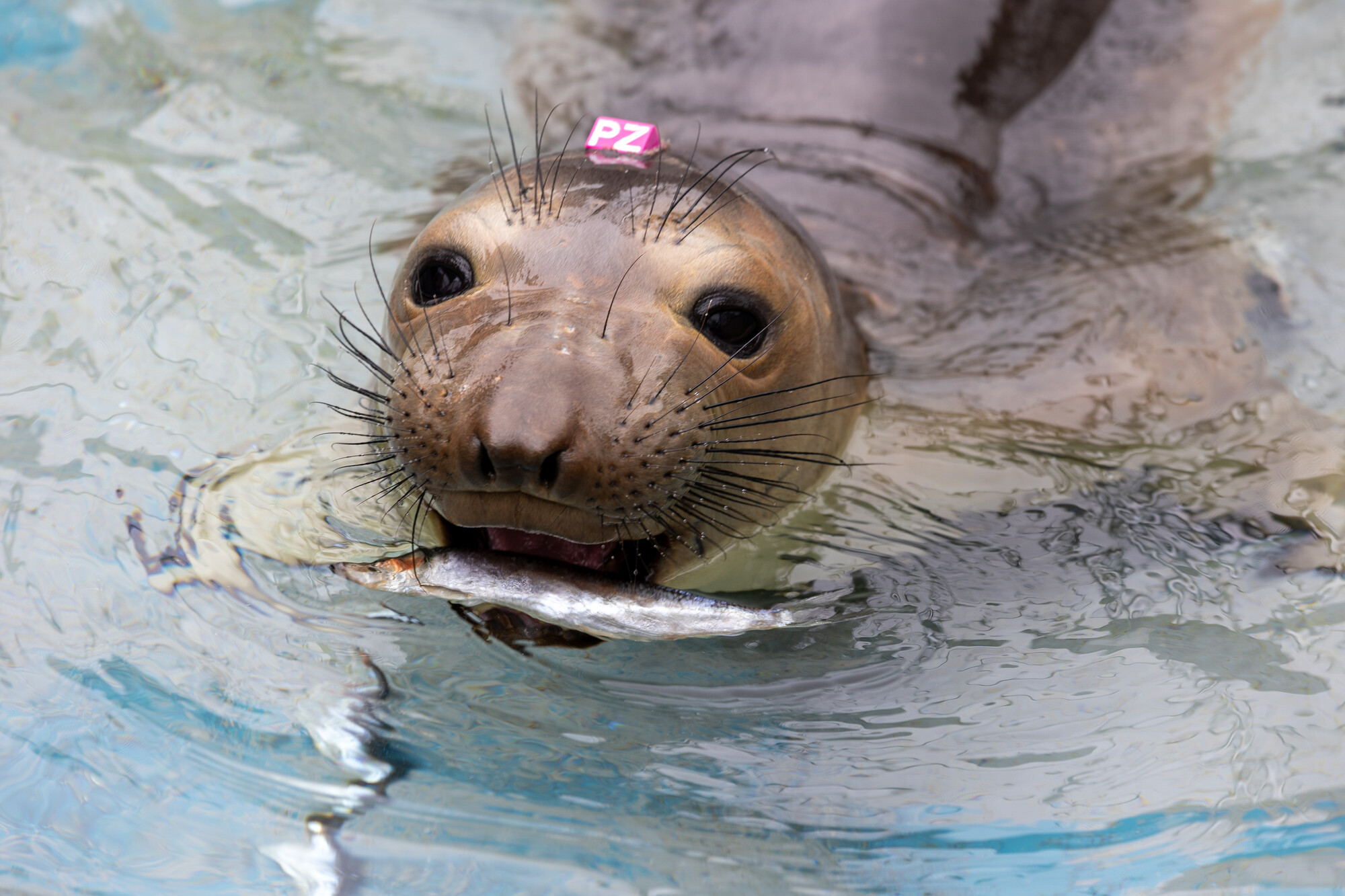 “PZ” Skrunchy emerges from the water with a sardine held between her jaws, whiskers dripping and eyes bright as she finishes her treat at the edge of the pool at the Marine Mammal Center in Sausalito. (Gustavo Hernandez/KQED)