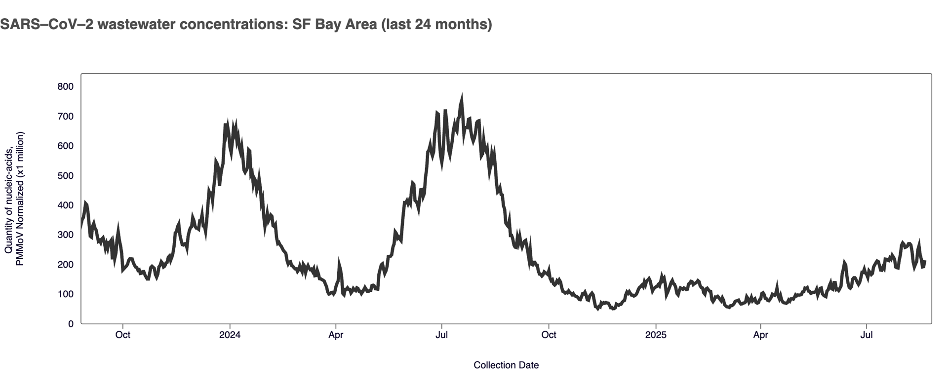 COVID-19 levels in Bay Area wastewater have gone up 50% in August compared to the month before, and are still far exceeding the winter peak, according to Stanford’s WastewaterSCAN team, which monitors coronavirus presence in human sewage. And according to the California Department of Public Health’s own wastewater tracking, infections statewide numbers also surpassed winter highs back in July.