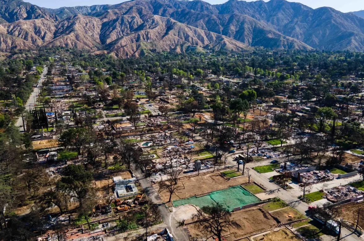 An aerial view of Altadena showing several cleared properties amongst many more awaiting to be cleared of debris and rubble from the Eaton Fire. (Brian Feinzimer/LAist)
