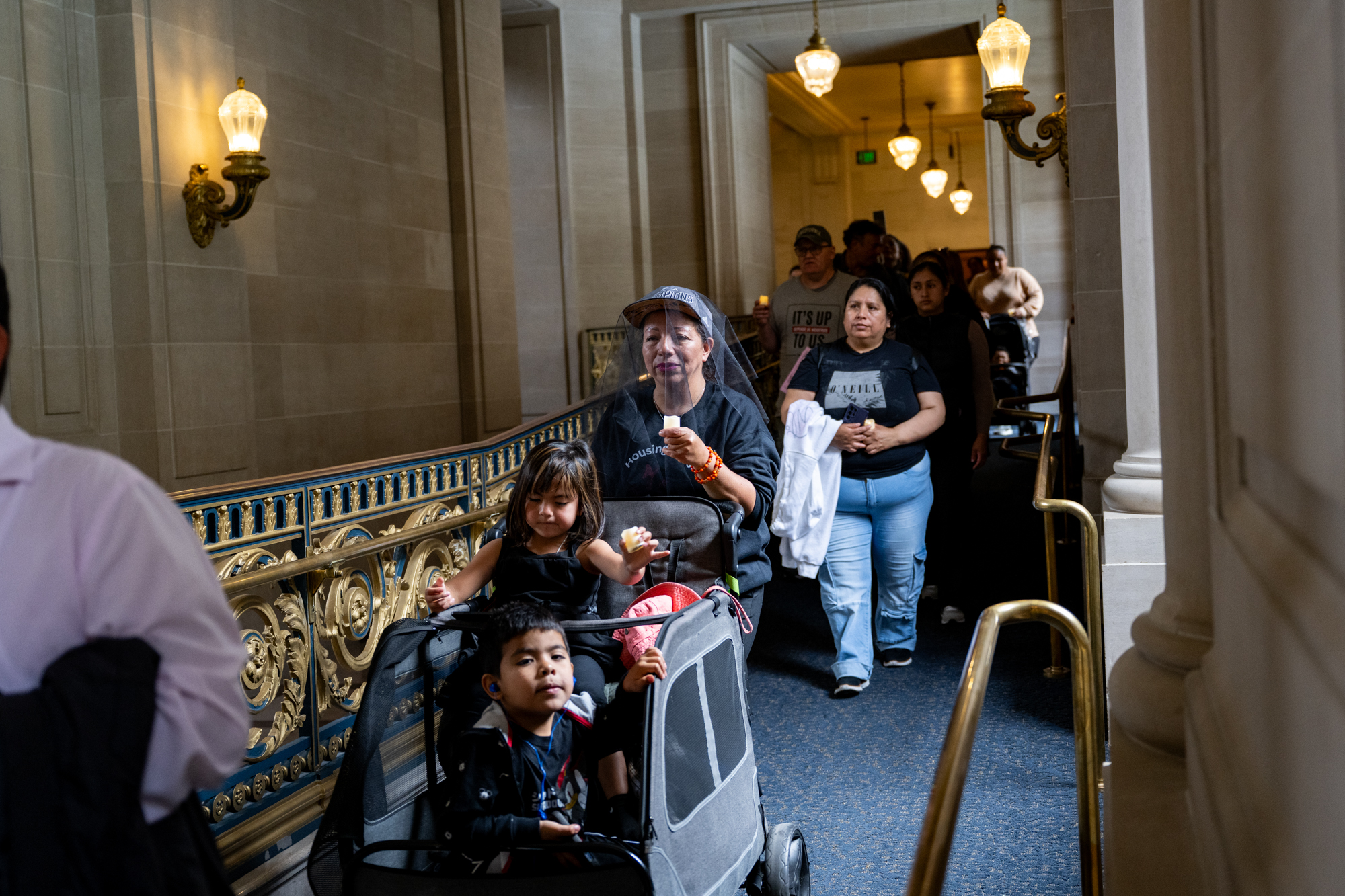 Maritza Salinas and her daughter Ranea, 4, and son Matthew, 6, attend a rally at City Hall in San Francisco on July 22, 2025, in opposition to a citywide RV ban. (Beth LaBerge/KQED)