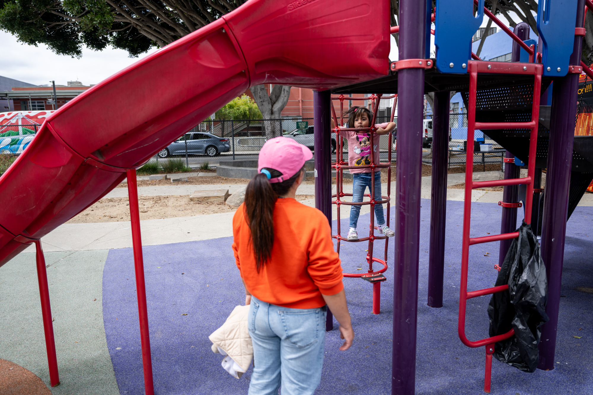Maritza Salinas plays with her daughter Ranea, 4, at a playground in San Francisco on July 22, 2025. (Beth LaBerge/KQED)