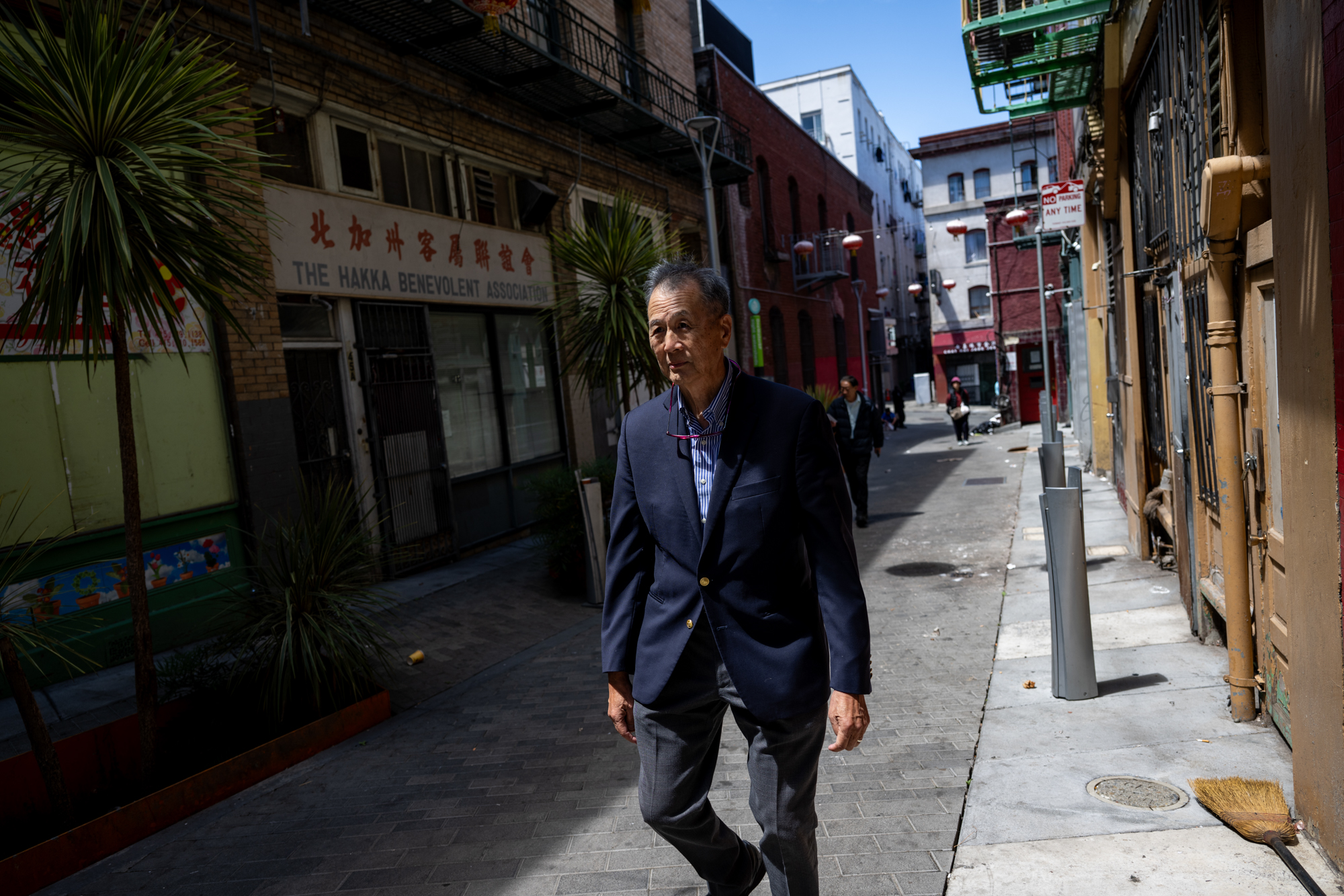 David Lei walks along Spofford Street in San Francisco’s Chinatown on July 29, 2025, the historical site of the Chinese Laundry Association, once located at 33 Spofford St. A longtime resident and community historian, Lei has worked to preserve Chinatown’s cultural and educational legacy. (Beth LaBerge/KQED)