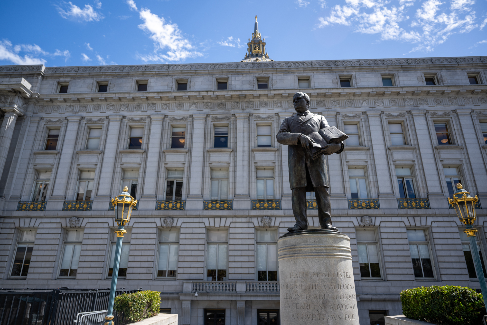 A statue of Hall McAllister stands near San Francisco City Hall on July 29, 2025. As a federal judge, McAllister ruled in favor of Yick Wo in the landmark civil rights case that affirmed equal protection under the 14th Amendment for Chinese immigrants. (Beth LaBerge/KQED)